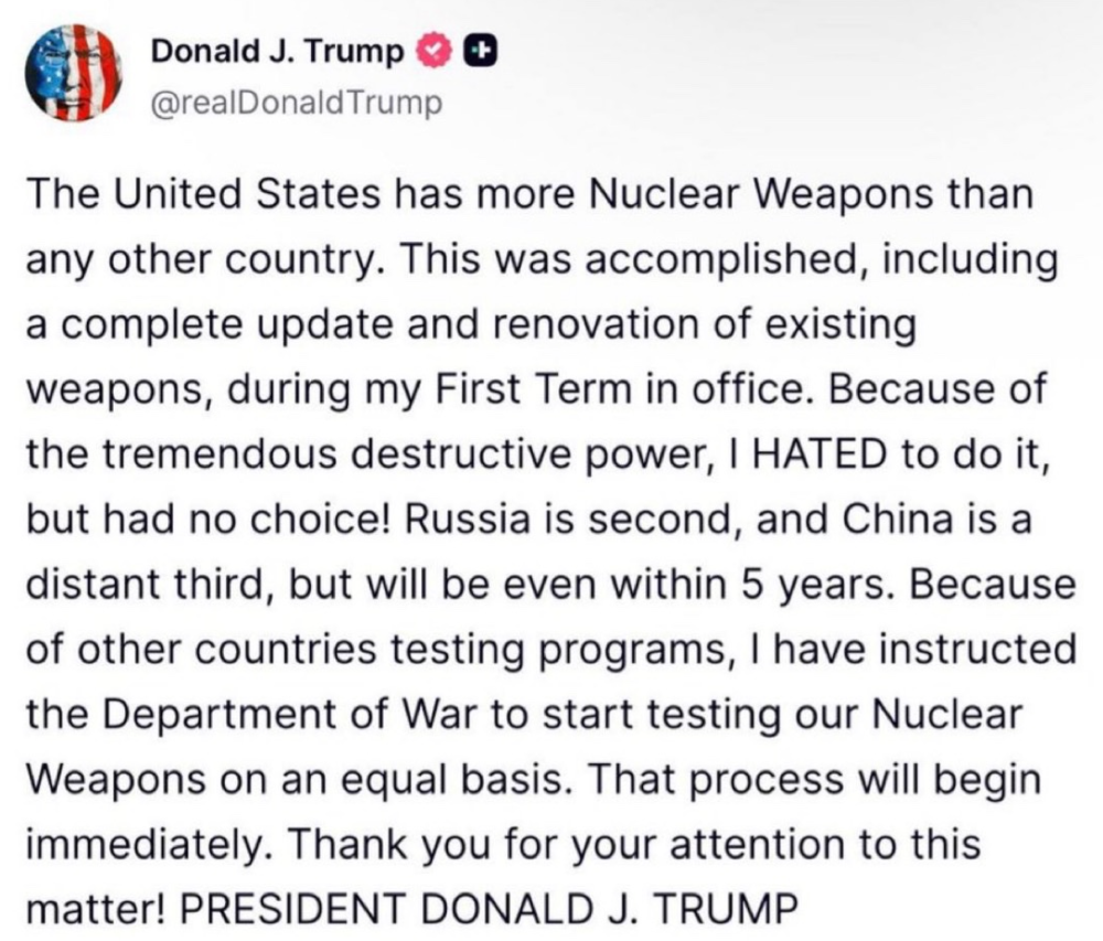 "Because of other countries’ testing programs, I have instructed the Department of War to start testing our Nuclear Weapons on an equal basis," Trump wrote. "That process will begin immediately."